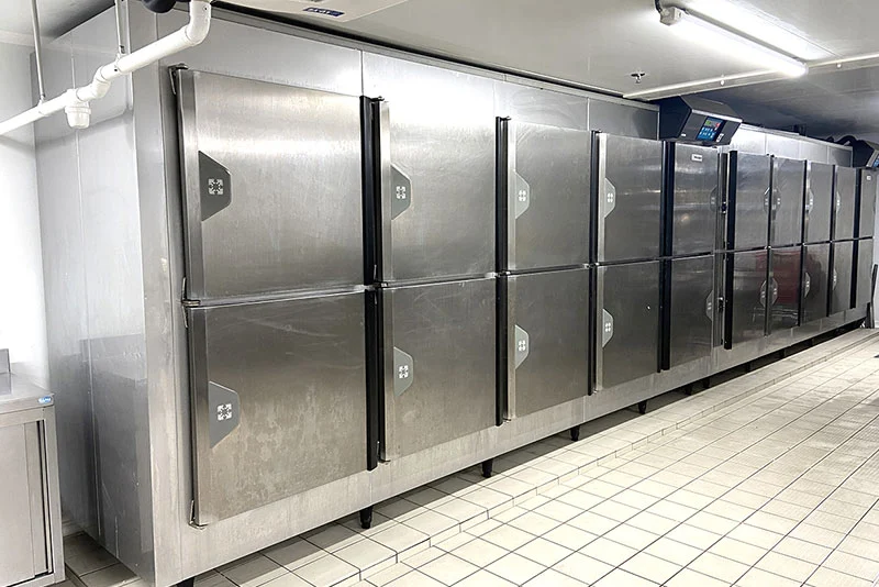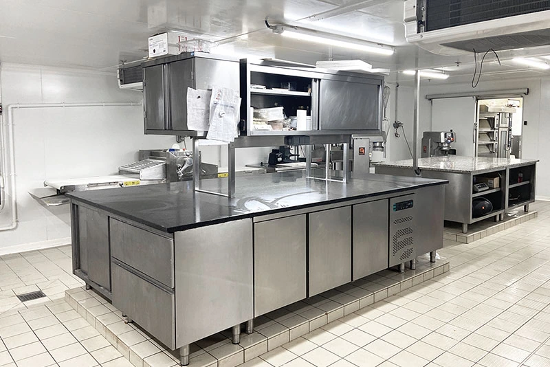 Chaque laboratoire dispose de zones dédiées à la cuisson, à la préparation, à la conservation et à la laverie. Des évaporateurs double-flux assurent une température homogène et stable, garantissant des conditions optimales pour le personnel et limitant les chocs thermiques pour les produits sensibles.