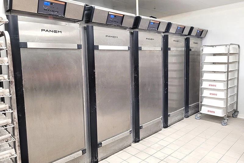 Le fournil a été repensé avec des fours rotatifs et un four à soles pour augmenter la production de pains traditionnels, accompagnés d’une façonneuse, d’un pétrin et de chambres de pousse en tunnel. Pour pallier le manque de personnel qualifié, une machine programmable dosant farine et eau permet de produire le pain sans nécessiter de connaissances approfondies en boulangerie.