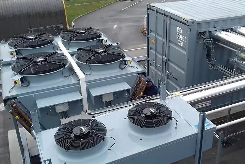 - Salle des machines en conteneur aménagé (isolation, détection CO2 , extraction, RAL spécifique, porte antipanique, extincteur...)
